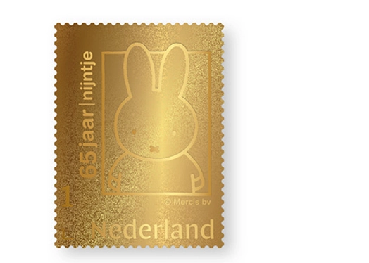 The gold stamp to celebrate Miffy’s 65th birthday can be ordered while stocks last only in the webshop and from the Collect Club customer service on +31 (0)88 868 99 00. The stamp is marked with ‘Nederland 1’, the denomination for items weighing up to 20g destined for delivery in the Netherlands. The validity period is indefinite.