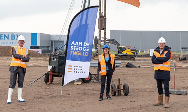 The Hague, 1 October 2020 – On 30 September, together with local organisations and the construction firm, PostNL celebrated the start of the construction work for a new parcel sorting centre at HoogTij business park in Westzaan. The Economy Alderman for Zaanstad, Hans Krieger, and Operations Manager of PostNL Pakketten, Iris van Wees, together symbolically laid the foundation stone for the sustainable new premises. The new location in Westzaan will help increase capacity for sorting and distributing parcels. PostNL expects to be able to process between 40,000 and 50,000 parcels there on a daily basis. PostNL is continuing its efforts to scale up and invest in new sorting locations in order to grow together with customers.