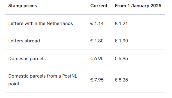From 1 January 2025, PostNL will raise its rates for sending letters within the Netherlands to €1.21 and the basic rate for letters sent abroad will be €1.90. Every year, PostNL issues special December stamps for the holiday season. The price of a PostNL December stamp will be €1.06 in 2024. A sheet of 20 December stamps will sell at €21.20 and will be available to buy from 18 November via postnl.nl, or at post offices, parcel points and other designated stamp outlets.