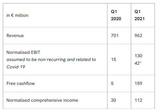 Strong earnings performance continues with normalised EBIT at €130 million and free cash flow of €159 million in Q1 2021