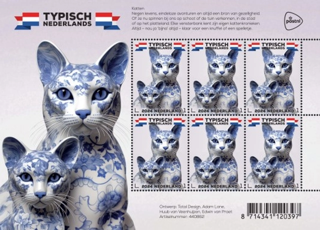 Het ontwerp van de postzegels ‘Typisch Nederlands – katten’ is gemaakt door het bureau Total Design uit Amsterdam met behulp van kunstmatige intelligentie. Deze uitgifte toont twee cyperse katten in de stijl van Delfts blauw aardewerk. Total Design bewerkte de door AI gegenereerde beelden verder door onder andere diepte te geven aan de snorharen. De postzegel toont een oudere en een jongere kat samen, in tegenstelling tot eerdere uitgiften die dieren van dezelfde generatie lieten zien.