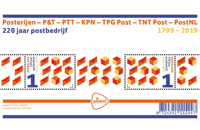 Den Haag, 24 januari 2019. In januari 1799, 220 jaar geleden, werden in ons land alle lokale posterijen genationaliseerd. PostNL, de erfgenaam van deze postbedrijven, besteedt aan dit bijzondere jubileum aandacht met de uitgifte van het postzegelvel 220 jaar postbedrijf.