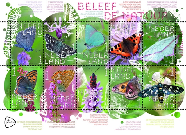 Het postzegelvel Beleef de natuur - vlinders telt 10 verschillende postzegels met de waardeaanduiding Nederland 1, bedoeld voor post tot en met 20 gram met een bestemming binnen Nederland. De postzegels zijn vanaf 11 juni 2019 verkrijgbaar bij alle verkooppunten van PostNL, het postkantoor in de Bruna-winkels en via de website. De postzegels zijn ook telefonisch te bestellen bij de klantenservice van Collect Club op telefoonnummer 088 - 868 99 00. De geldigheidstermijn is onbepaald.