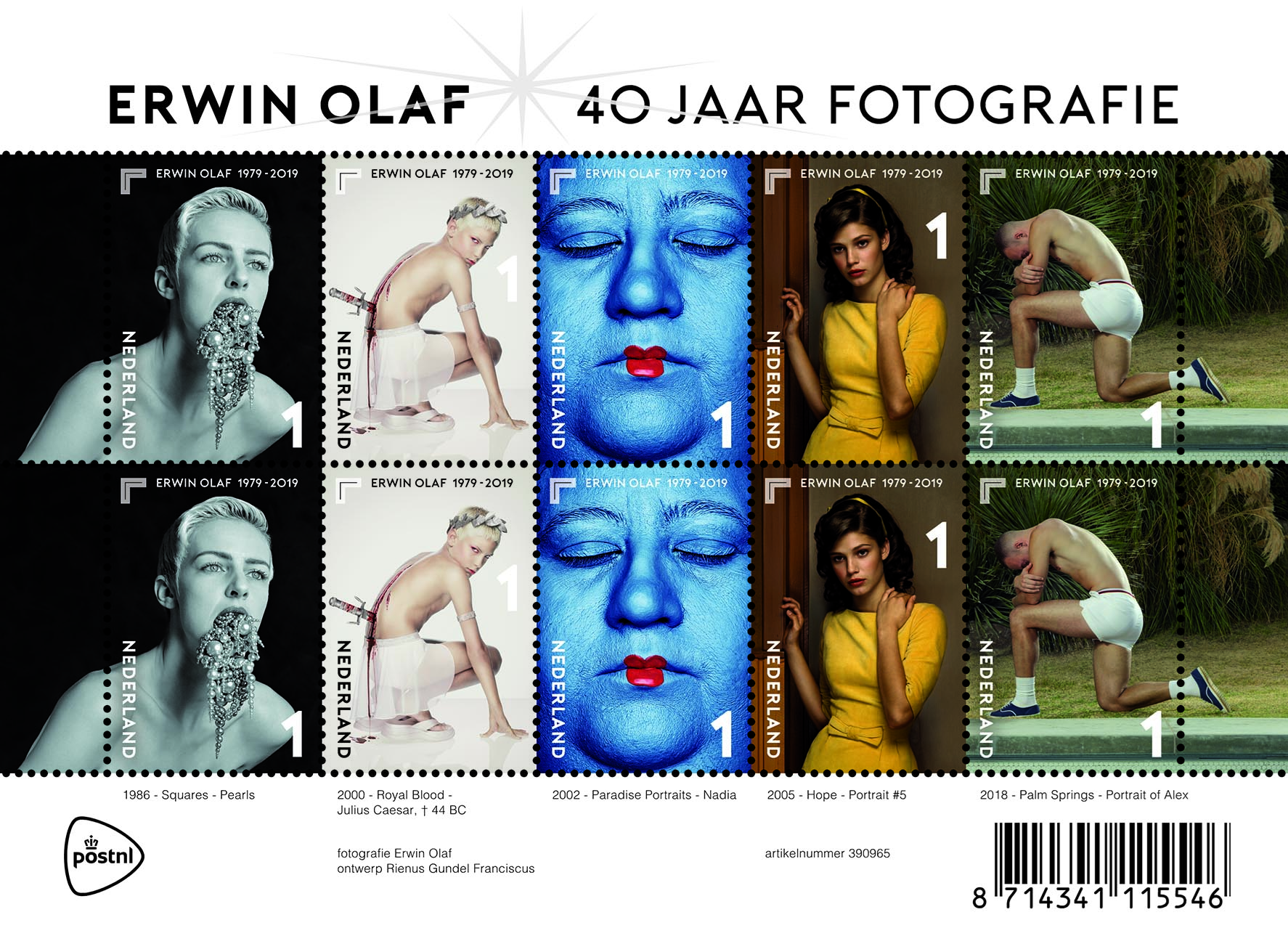 Op het postzegelvel ‘Erwin Olaf 40 jaar fotografie’ staan vijf iconische foto’s van zijn hand. De vijf zijn ‘Pearls’ (1986), ‘Julius Caesar, † 44 BC’ (2000), ‘Nadia’ (2002), ‘Portrait #5’ (2005) en ‘Portrait of Alex’ (2018). Alle foto’s zijn onmiskenbaar Erwin Olaf, die een “perfecte wereld wil laten zien met een barst erin”. Op sommige onderdelen van het postzegelvel is met zeefdruk UV-lak (spotvernis) aangebracht. Het ontwerp van de postzegels is gemaakt door grafisch ontwerper Rienus Gundel Franciscus uit Amsterdam.