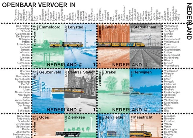 De 2 postzegelvellen Openbaar vervoer in Nederland tellen beide 6 verschillende postzegels. Het eerste vel is bedoeld voor post tot en met 20 gram met een bestemming binnen Nederland, het tweede vel voor post tot en met 20 gram met een internationale bestemming. De postzegels zijn vanaf 19 augustus 2019 verkrijgbaar bij het postkantoor in de Bruna-winkels en via de website van PostNL. De postzegels zijn ook telefonisch te bestellen bij de klantenservice van Collect Club op telefoonnummer 088 - 868 99 00. De geldigheidstermijn is onbepaald.
