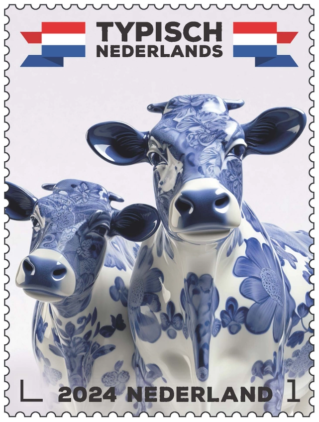 De postzegels ‘Typisch Nederlands – koeien’ zijn ontworpen door het bureau Total Design uit Amsterdam. Met behulp van kunstmatige intelligentie maakten zij een ontwerp rondom gefantaseerde beeldjes in de vorm van Delfts blauw aardewerk.