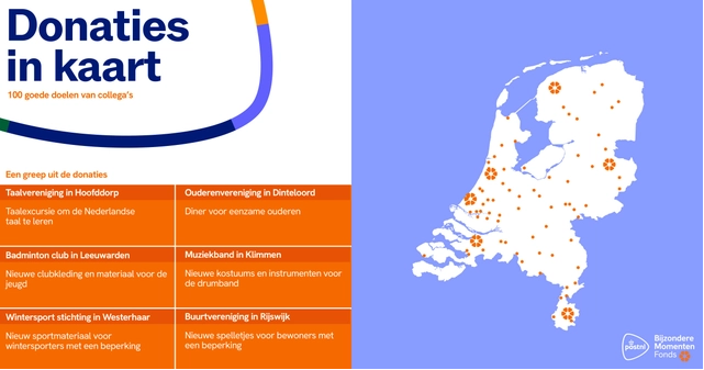 Den Haag, 10 november 2023 - PostNL heeft 100 verenigingen en stichtingen verrast met een donatie vanuit het PostNL Bijzondere Momenten Fonds. Afgelopen maand konden PostNL-collega’s een donatie van 250 euro aanvragen bij het PostNL Bijzondere Momenten Fonds voor de vereniging of stichting waar zij vrijwilliger zijn. De donaties werden uit het hele land aangevraagd voor uiteenlopende maatschappelijke doelen. Van een verwendag voor moeders van kinderen met autisme tot sporttenues voor een lokale sportclub.