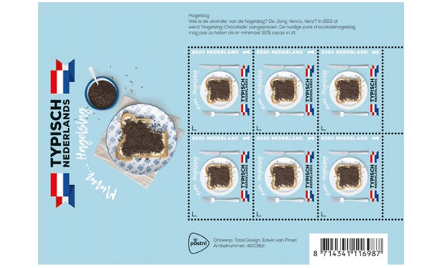 Het postzegelvel Typisch Nederlands - hagelslag telt 6 gelijke postzegels met de waardeaanduiding Nederland 1, bedoeld voor post tot en met 20 gram met een bestemming binnen Nederland. De postzegels zijn vanaf 23 maart 2020 verkrijgbaar bij het postkantoor in de Bruna-winkels en via www.postnl.nl/bijzondere-postzegels. De postzegels zijn ook telefonisch te bestellen bij de klantenservice van Collect Club op telefoonnummer 088 - 868 99 00. De geldigheidstermijn is onbepaald.