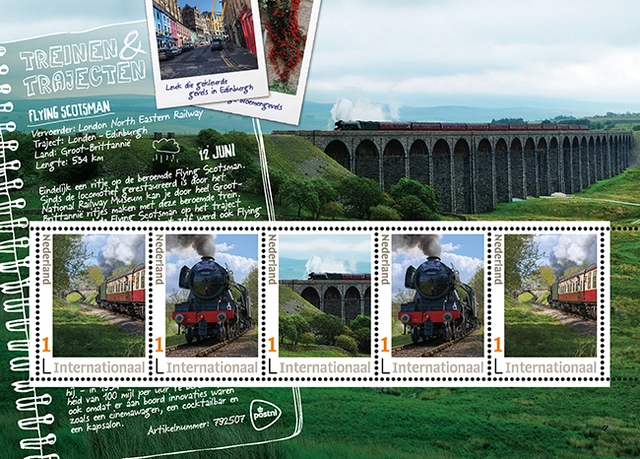 De Flying Scotsman rijdt in Groot-Brittannië op het traject Londen-Edinburgh. Deze treinverbinding is al sinds 1862 operationeel. De naam Flying Scotsman dateert van 1928. Flying Scotsman is ook de naam van een van de beroemdste locomotieven in de wereld. Deze werd in 1923 gebouwd en tussen 2006 en 2016 door het National Railway Museum volledig gerestaureerd. Leunstoelreizigers en treinliefhebbers De serie Treinen & Trajecten met persoonlijke postzegels is ontworpen door grafisch ontwerper Sandra Smulders uit Gouda. De postzegels zijn voor zowel leunstoelreizigers als treinliefhebbers bestemd. “Vandaar ook dat ik in het ontwerp regelmatig inzoom op details van het materieel”, zegt Smulders. “Zoals bijzondere locomotieven of het prachtige interieur van sommige wagons. Toen ik met dit ontwerp begon, wist ik niet veel van treinen. Nu veel meer. Het heeft me zeker getriggerd om ook zelf eens zo’n fantastische reis te maken.”