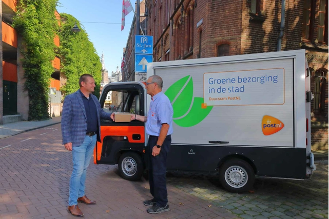 Den Haag, 11 september 2023. In het centrum van Den Bosch is PostNL gestart met de bezorging van pakketten met de inzet van LEVV's. Deze licht elektrische vrachtvoertuigen zijn volledig uitstootvrij en een stuk kleiner dan een gewone bestelbus. . Dat is dus goed voor het klimaat én de omgeving. Met de inzet van deze voertuigen helpt PostNL de stad leefbaar te houden.