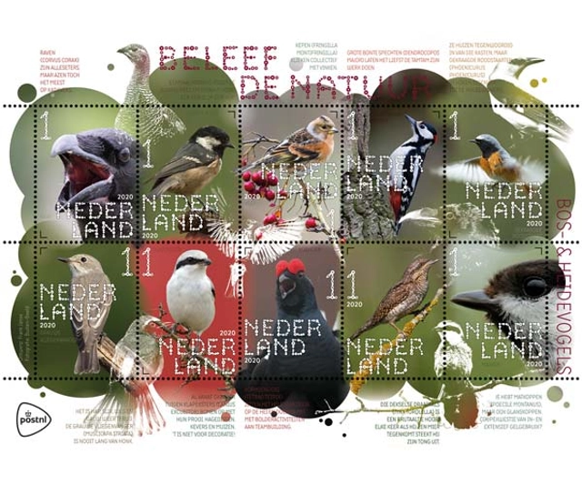 Eerder dit jaar bracht PostNL al postzegels uit over roofvogels en uilen (2 januari), boerenlandvogels (24 februari) en kustvogels (15 juni). Het postzegelvel over bos- en heidevogels is de laatste van dit jaar uit deze serie. In de losse verkoop kost elk postzegelvel ‘Beleef de natuur’ € 9,10. De prijs voor de volledige serie 2020 is € 36,40, inclusief bewaarmap.