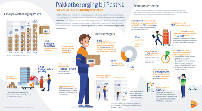 PostNL heeft zich in de afgelopen jaren hard gemaakt voor meer pakketbezorgers in loondienst. Inmiddels heeft 80% van de pakketbezorgers een arbeidsovereenkomst en werkt in loondienst óf bij PostNL (PostNL-cao) óf bij een ondernemer (BGV-cao).Liesbeth Kaashoek, directeur Pakketten & Logistiek van PostNL zegt: “De pakketbezorgers van PostNL zijn cruciaal voor ons bedrijf en worden met een ruime 8,5 gewaardeerd door de mensen die pakketten thuis ontvangen. Wij zijn ook heel blij dat we met 70% van onze bezorgondernemers al meer dan 10 jaar samenwerken. De meeste ondernemers groeien met ons mee door meer routes te rijden als zij dat willen. De uitkomsten van dit onderzoek laten een mooie stijging zien in een jaar dat het online winkelen een grote vlucht heeft genomen.” Vanaf het begin van de coronacrisis hebben consumenten in Nederland en België aanzienlijk meer besteld bij webshops. Deze stijging heeft geleid tot fors hogere volumes en meer omzet voor bezorgondernemers.