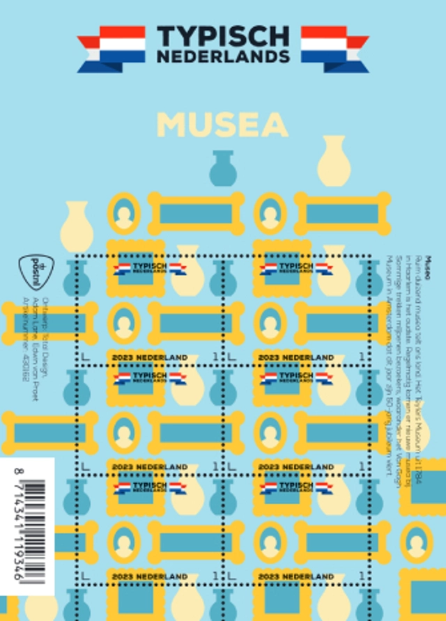 Het ontwerp van ‘Typisch Nederlands – musea’ is van de hand van senior grafisch ontwerper Adam Lane en creative directorEdwin van Praet, van Total Design uit Amsterdam. In de serie verschijnen later dit jaar postzegelvellen met als onderwerp molens (13 februari), bloemenvelden (20 maart), kaasmarkten (20 maart) en wadden (14 augustus).