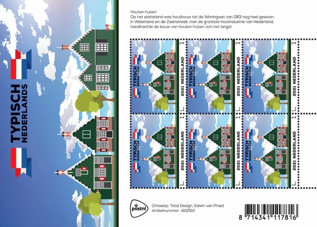 Het postzegelvel Typisch Nederlands – houten huizen telt 6 gelijke postzegels met de waardeaanduiding Nederland 1, bedoeld voor post tot en met 20 gram met een bestemming binnen Nederland. De postzegels zijn vanaf 22 februari 2021 verkrijgbaar bij de Bruna-winkels en via www.postnl.nl/bijzondere-postzegels. De postzegels zijn ook telefonisch te bestellen bij de klantenservice van Collect Club op telefoonnummer 088 - 868 99 00. De geldigheidstermijn is onbepaald.