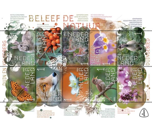 De serie Beleef de natuur voor 2021 is ontworpen door grafisch ontwerper Frank Janse uit Gouda. Dit jaar is in de serie de hoofdrol weggelegd voor de flora en fauna van bijzondere Nederlandse natuurgebieden. Bij de selectie ervan werkte Janse samen met natuurbeschermingsorganisatie Natuurmonumenten. Voor het postzegelvel Beleef de natuur – Duin en Kruidberg stelde hij een kandidatenlijst met dieren en planten op, waarvan er uiteindelijk 10 overbleven: duinparelmoervlinder, konijn, vos, duindoorn, parnassia, damhert, nachtegaal, duinviooltje, grote tijm en konikpaard.