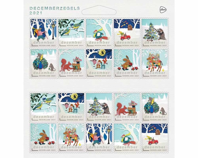 Den Haag, 15 november 2021 – Een eekhoorn die een slee met geschenken en lekkernijen voortduwt en een vos met wapperende sjaal en envelop; de illustraties op de decemberzegels van dit jaar zijn knipkunstwerken die volledig bestaan uit lagen gekleurd papier. Deze zogenoemde ‘papercuts’ zijn gemaakt door illustrator Geertje Aalders. Het resultaat zijn feestelijke en fantasievolle decemberzegels mét een verhaal. Die decemberzegels, met het speciale decembertarief, zijn verkrijgbaar vanaf 15 november.