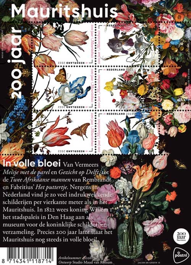 Den Haag, 21 februari 2022 - PostNL geeft vandaag kleurrijke postzegels uit ter gelegenheid van het jarige Mauritshuis. Dit jaar is het 200 jaar geleden dat het Mauritshuis zijn deuren opende als museum. Medeoprichter van het museum was Koning Willem I. Op het postzegelvel zijn beroemde bloemstillevens uit het jarige museum gecombineerd tot een nieuw werk.