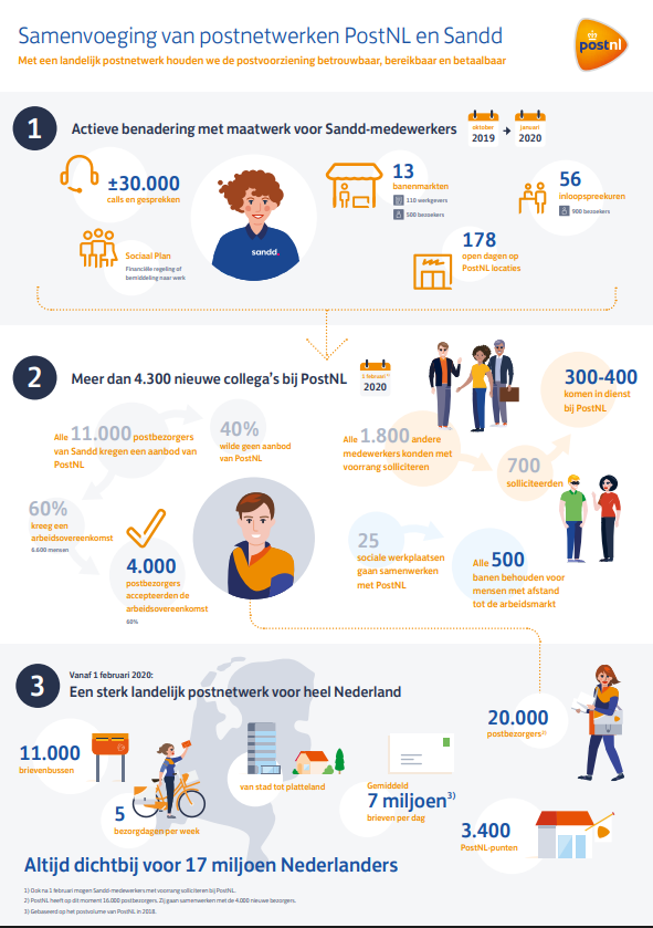 Den Haag, 30 januari 2020 – Op 1 februari wordt de samenvoeging van de postnetwerken van PostNL en Sandd afgerond. Dat betekent dat de post vanaf die dag door één sterk landelijk postnetwerk wordt bezorgd. De samenvoeging maakt het mogelijk om overal in Nederland vijf dagen per week post te kunnen blijven versturen en ontvangen. En dankzij de samenvoeging blijft de werkgelegenheid in de postsector als geheel zo veel mogelijk in stand. PostNL verwelkomt meer dan 4.300 nieuwe medewerkers van Sandd. PostNL bevestigt de strategische en financiële uitgangspunten voor waardecreatie zoals gepresenteerd op 1 oktober 2019.
