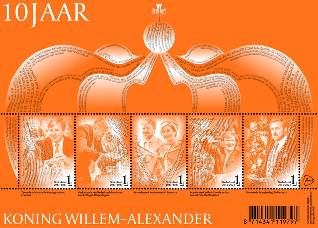 Op 30 april 2023 is het 10 jaar geleden dat kroonprins Willem-Alexander zijn moeder koningin Beatrix opvolgde en Koning der Nederlanden werd. De foto’s op de jubileumpostzegels illustreren duidelijk hoe de koning sindsdien zijn publieke rol vervult.