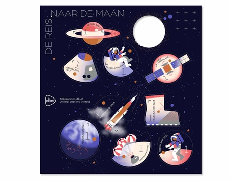Op de 9 postzegels van het postzegelvel “De reis naar de maan“ staan illustraties die met ruimte en ruimtevaart te maken hebben. In het vel ontbreekt de 10e postzegel: de maan. De uitgestanste cirkelvorm staat symbool voor de maanpostzegel die PostNL wil uitgeven zodra de mens in 2025 weer voet op de maan zet. Op donderdag 20 april overhandigde Noud Wegman (Directeur Commercie MailNL) bij Airbus in Leiden het eerste vel van deze postzegels aan Rob Postma (Managing Director Airbus Netherlands), ook in het bijzijn van Space Expo.